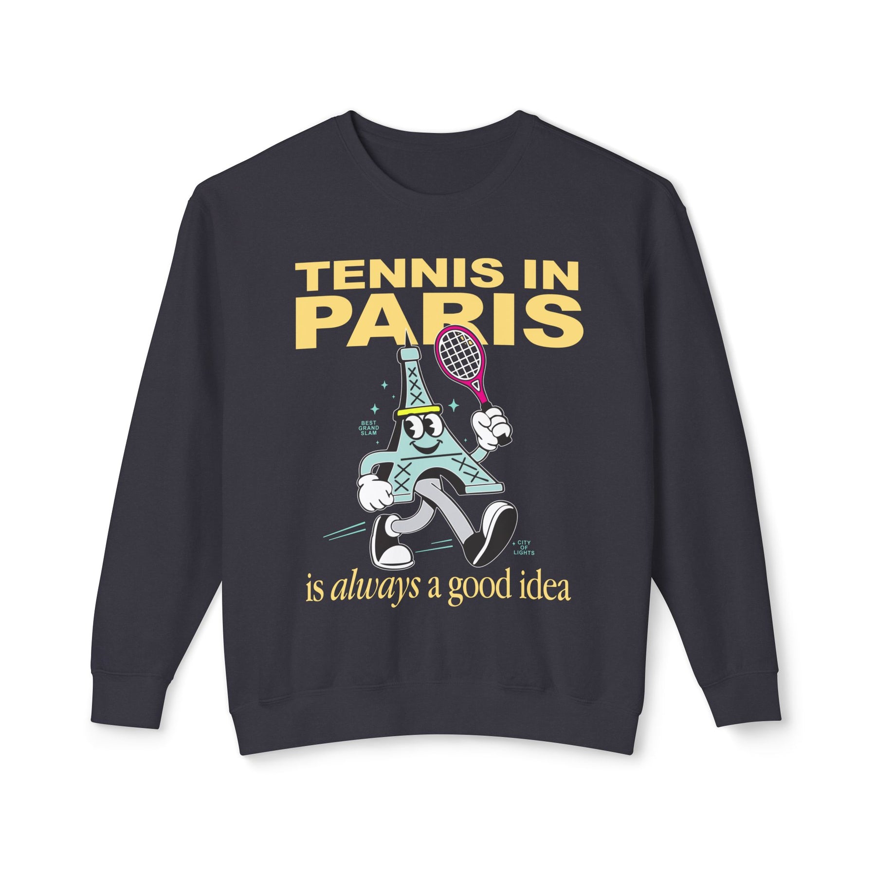Welcome to the unofficial uniform of Roland Garros superfans. This isn’t just a French Open sweatshirt — it’s a love letter to the glory, irony, and mythology of clay court season. Featuring a retro mascot with main-character energy, the artwork flips the romance of Paris into pure meme-meets-merch magic. A racket-swinging Eiffel Tower struts across your chest like it’s late for a five-set war on Court Philippe Chatrier. Playful, nostalgic, and just the right amount of ridiculous, this lightweight crew was made for fans who believe tennis apparel should be fun — and fandom should be flaunted.